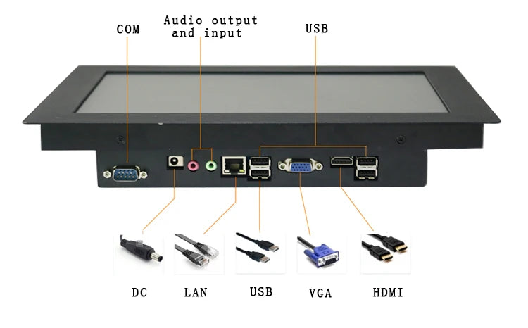 - Connectivity: you connect via HDMI, VGA, 2 x COM ports (RS232 by default; RS485 option on request), RJ45, USB, audio; plus built-in WiFi and Bluetooth.