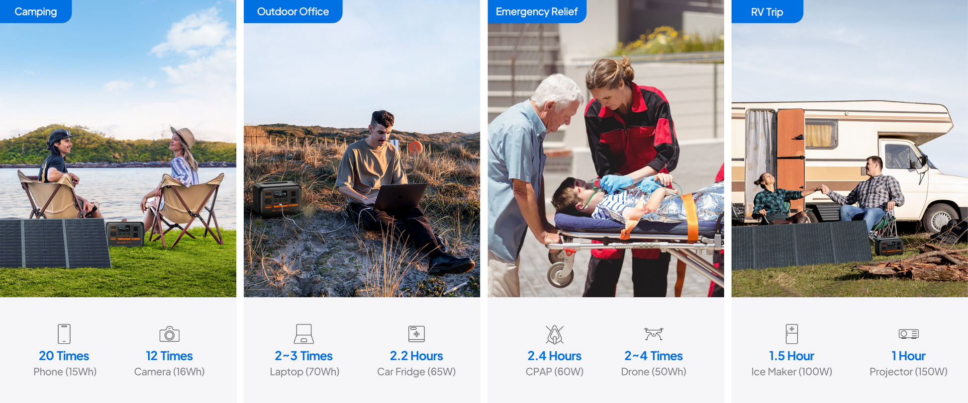 Efficiently charge it as you prefer - via AC outlet, solar panels, generator, or even a car charger while you’re driving, no need to worry about the battery running out when miles away from the grid.