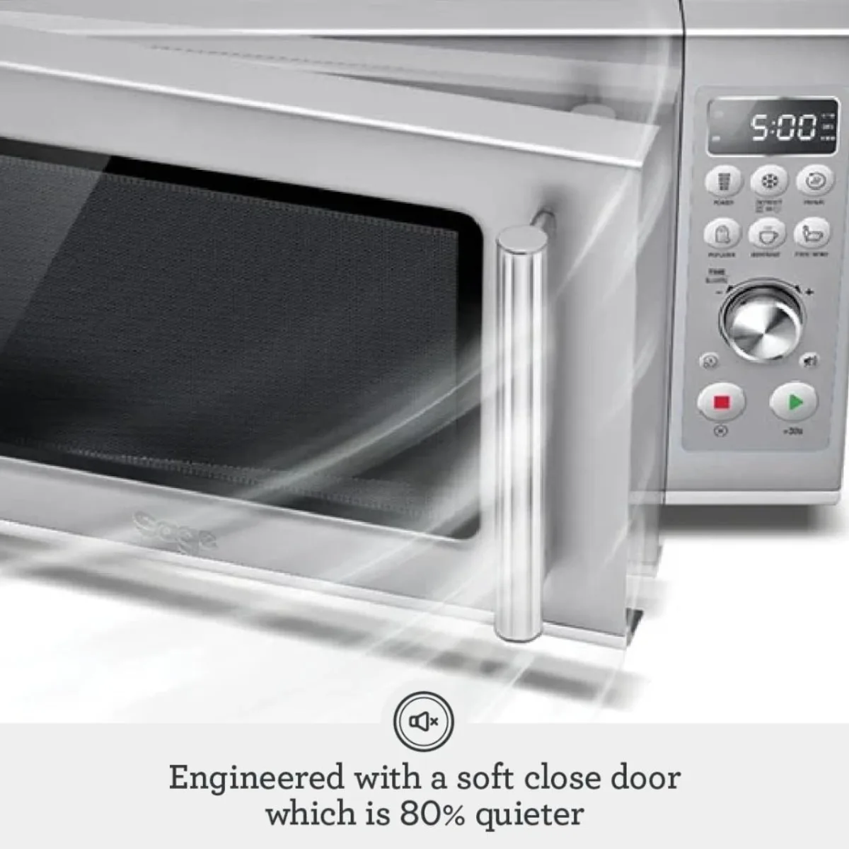 - QUIET MICROWAVE WITH SOFT CLOSE DOOR: Countertop microwave has 80% quieter soft close door and is 50% quieter in operation; Clever touches like Child Lock, Breville Sound Suite and Mute button mean less beeps and clangs, more pops and crunches