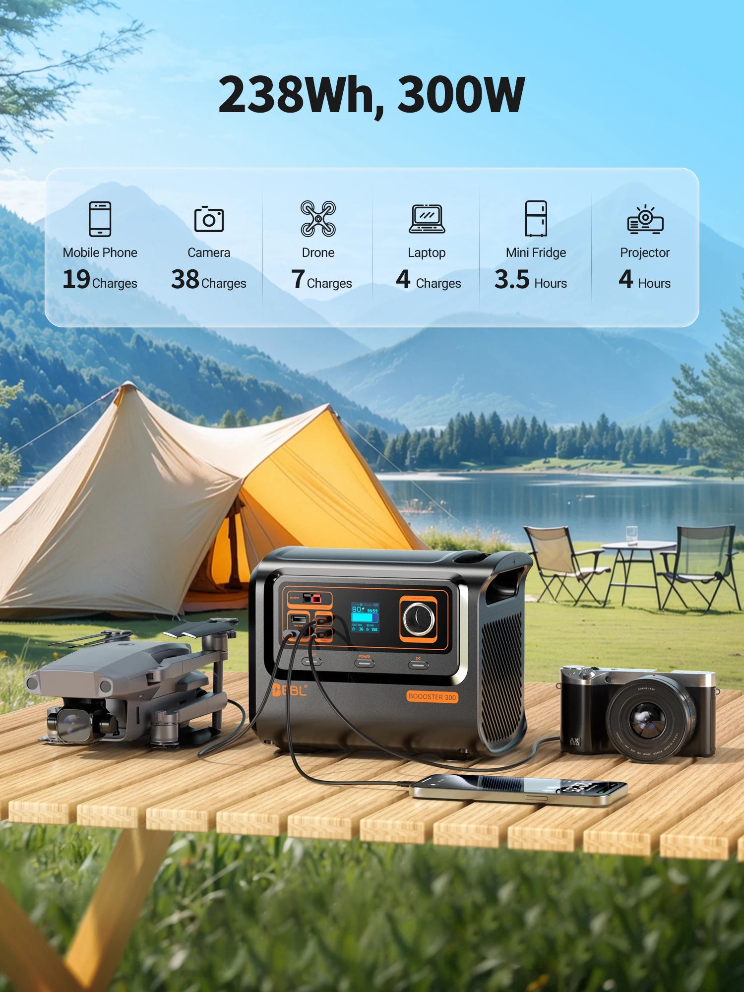 238WH CAPACITY, 300W OUTPUT - 300W (600W surge) pure sine wave supports most laptops, tablets, phones, lights, fans, CPAP medical devices, projectors, TV, mini-refrigerator, speaker, camera (rated power less than 300W). 238Wh huge capacity but light weight makes it compact and perfect for camping, car trips and other family outings.