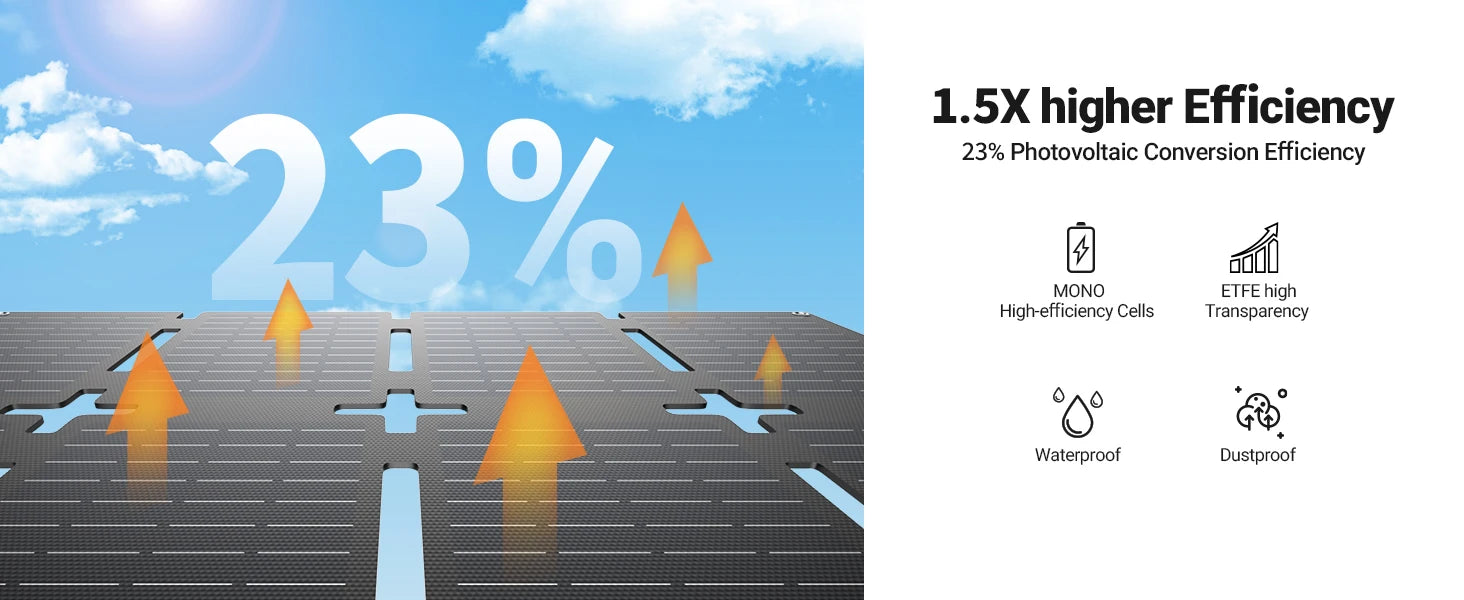 23% HIGH CONVERSION RATE - 40W solar panel changer is made with premium mono-crystalline UV-resistant EVA and efficient solar cells with high light transmission ETFE material, generates energy from the sunlight, and perform better with 23% higher conversion efficiency, providing unlimited green power for your device under the sun. Smart charging technology with built-in smart chip intelligently identifies your device and provides the best charging speed according to different devices.