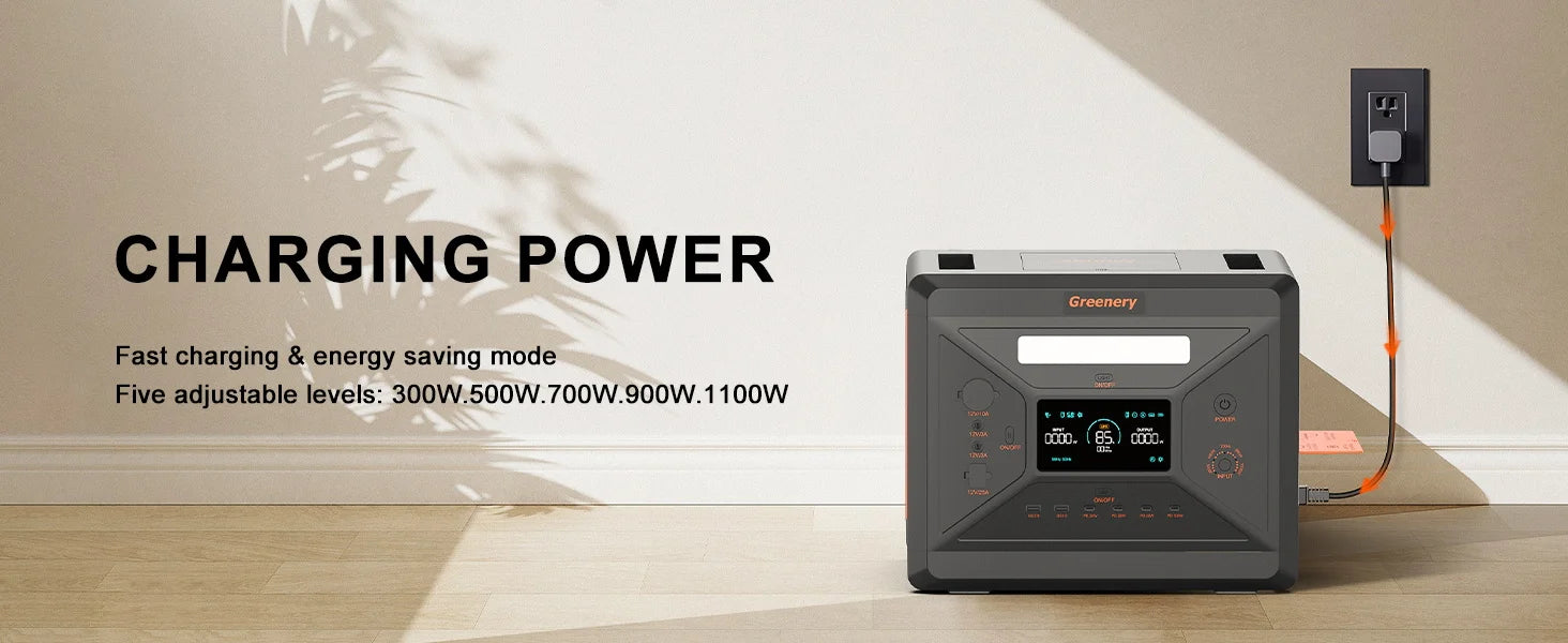 - Flexible charging — five input levels (300W, 500W, 700W, 900W, 1100W) plus solar input up to 300W; dual charging can fully recharge in about 1.5 hours.