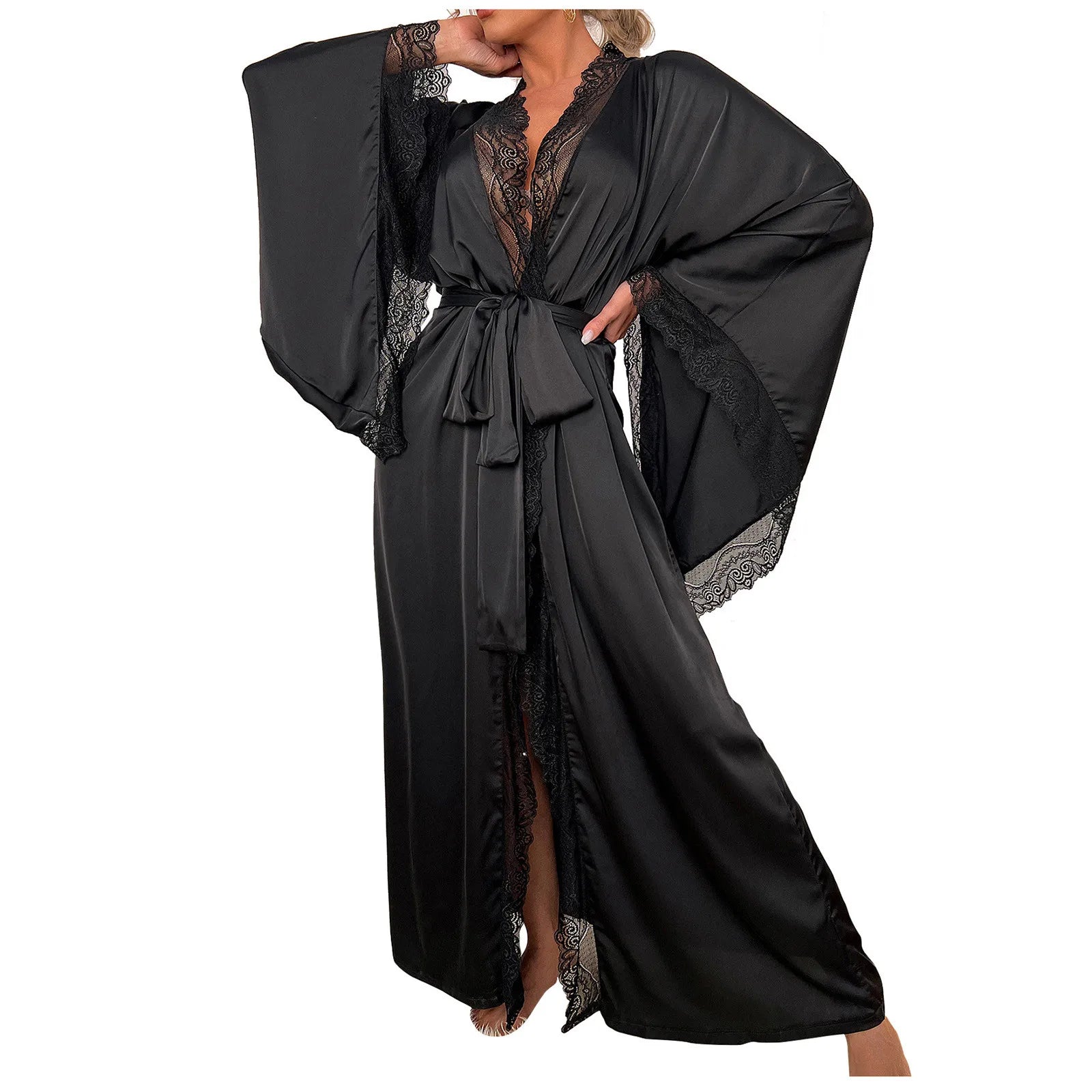Long Solid Kimono Robe Women Sexy Lace Patchwork Bathrobe Gown Flare Sleeve Sleepwear Nightwear Bride Wedding Robes Loungewear