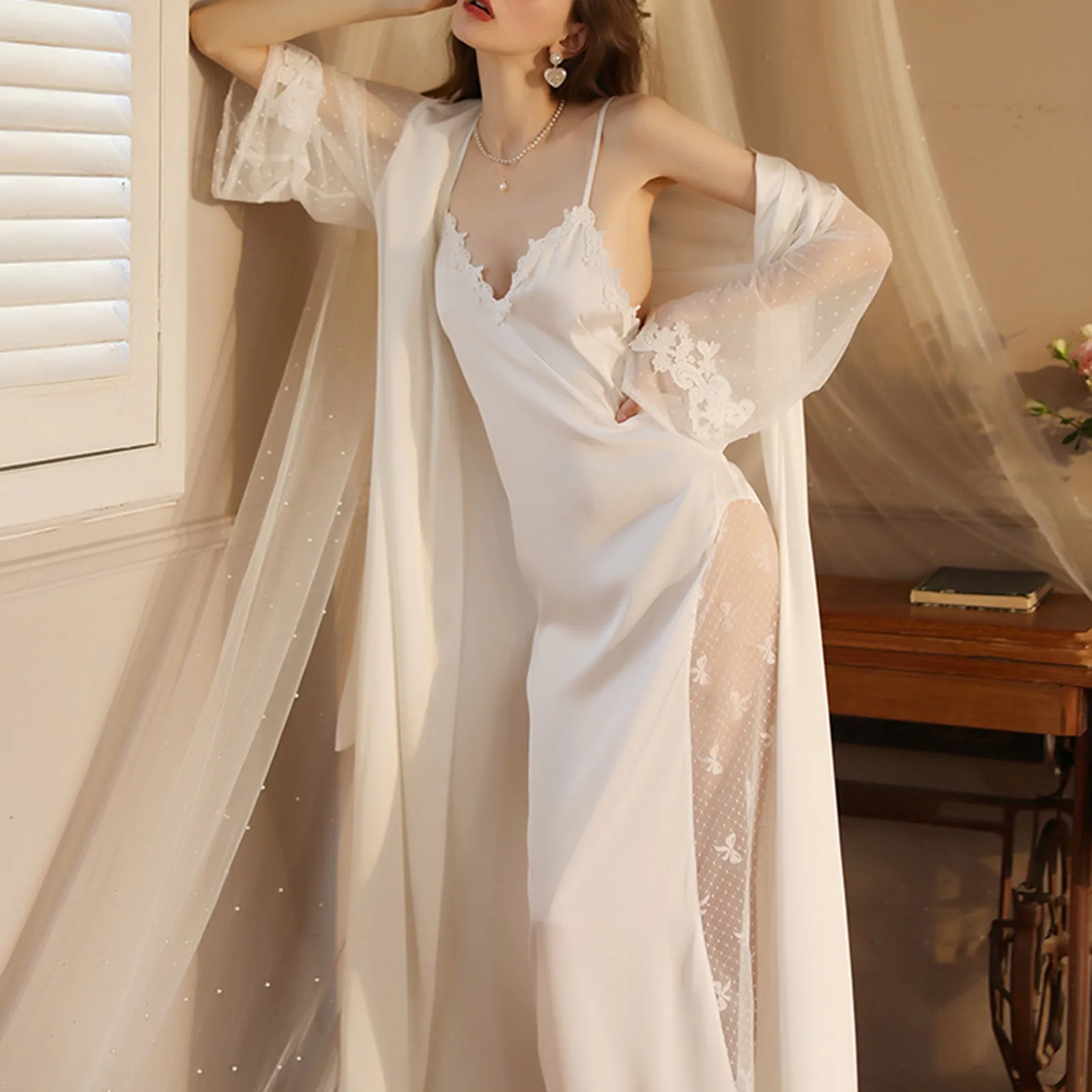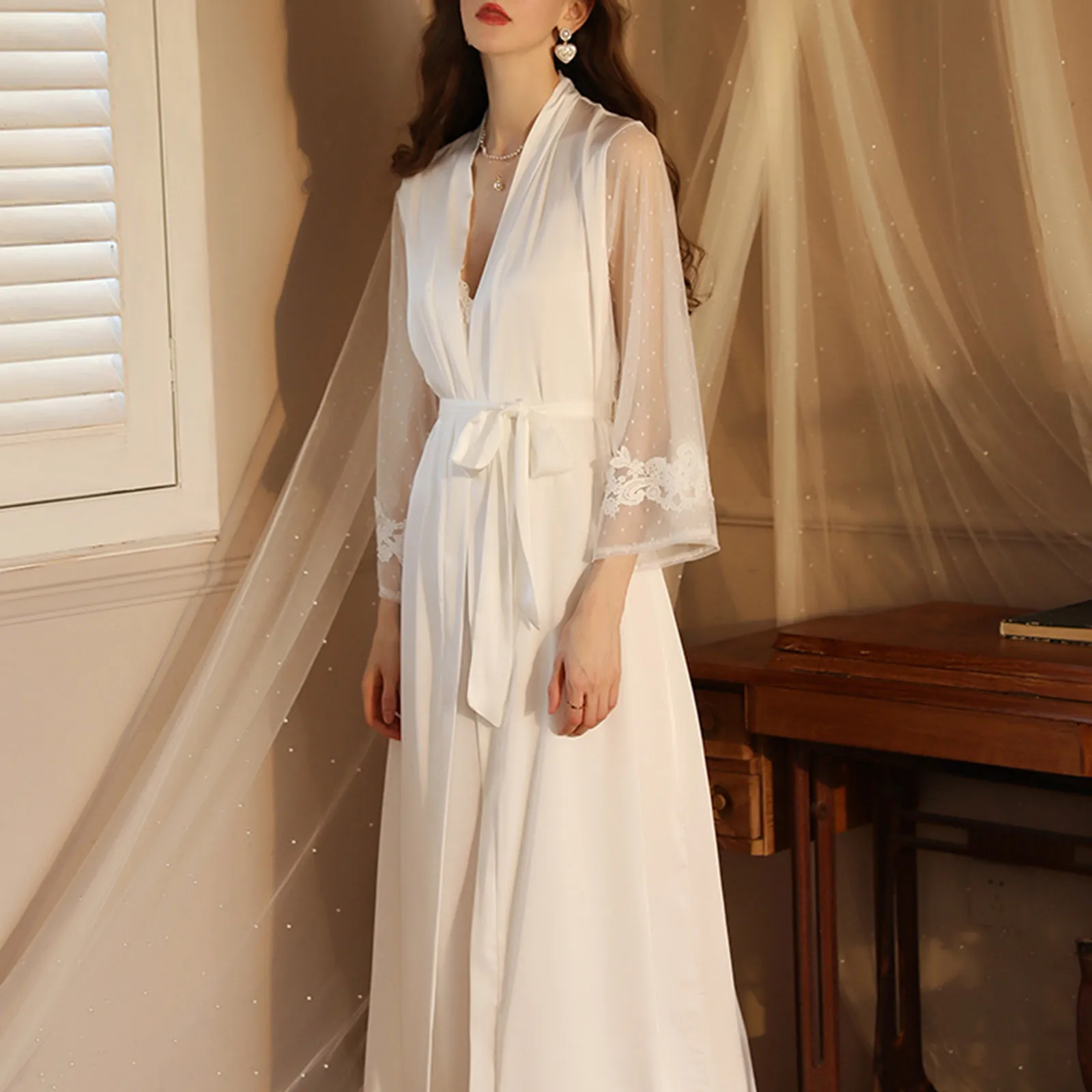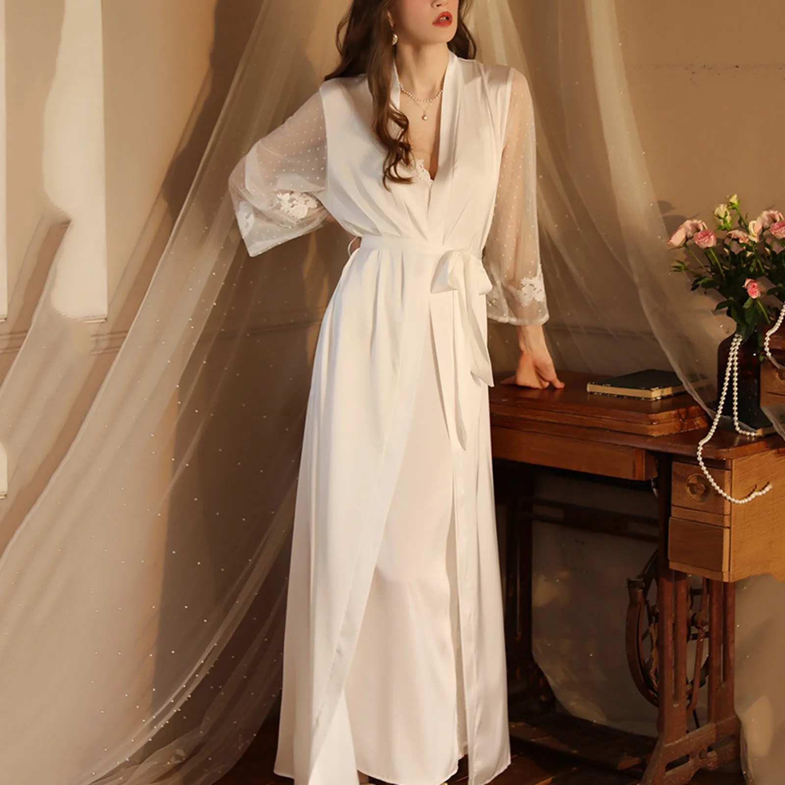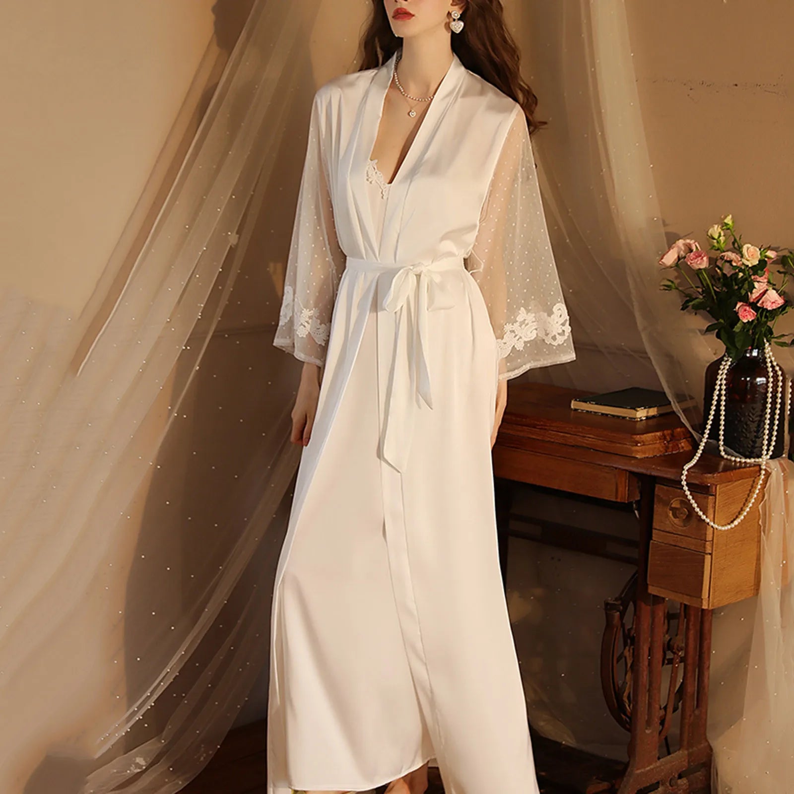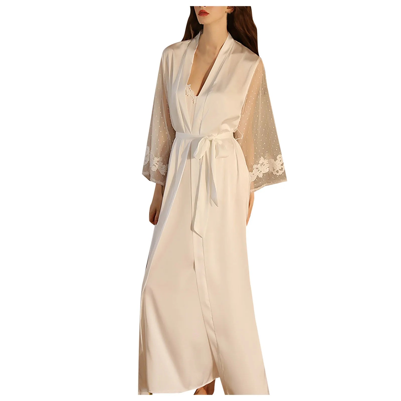 Women Fashion Lace Sexy Long Sleeve Ice Silk Length Bathrobe Bridesmaid Nightgown Bathrobe Sleepwear