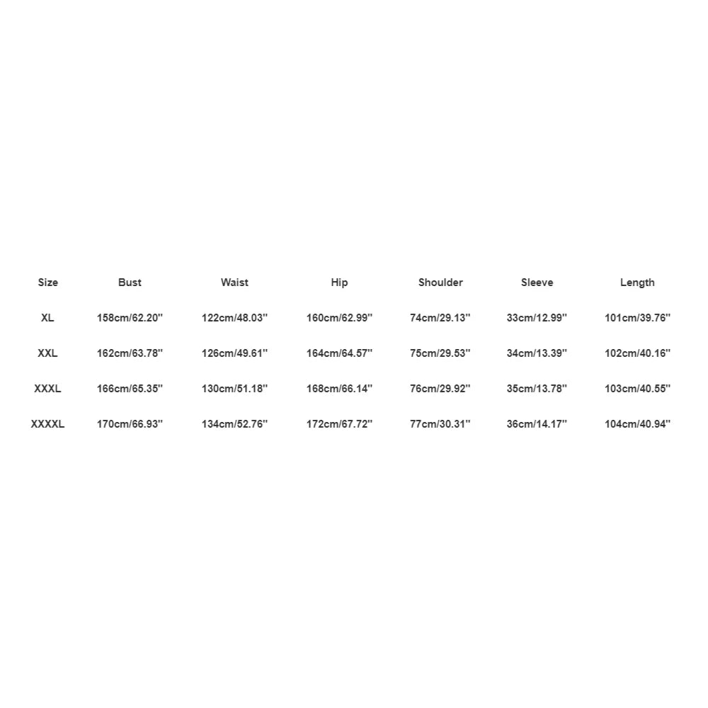 | Size:XL | Bust:158cm/62.20'' | Waist:122cm/48.03'' | Hip:160cm/62.99'' | Shoulder:74cm/29.13'' | Sleeve:33cm/12.99'' | Length:101cm/39.76'' |