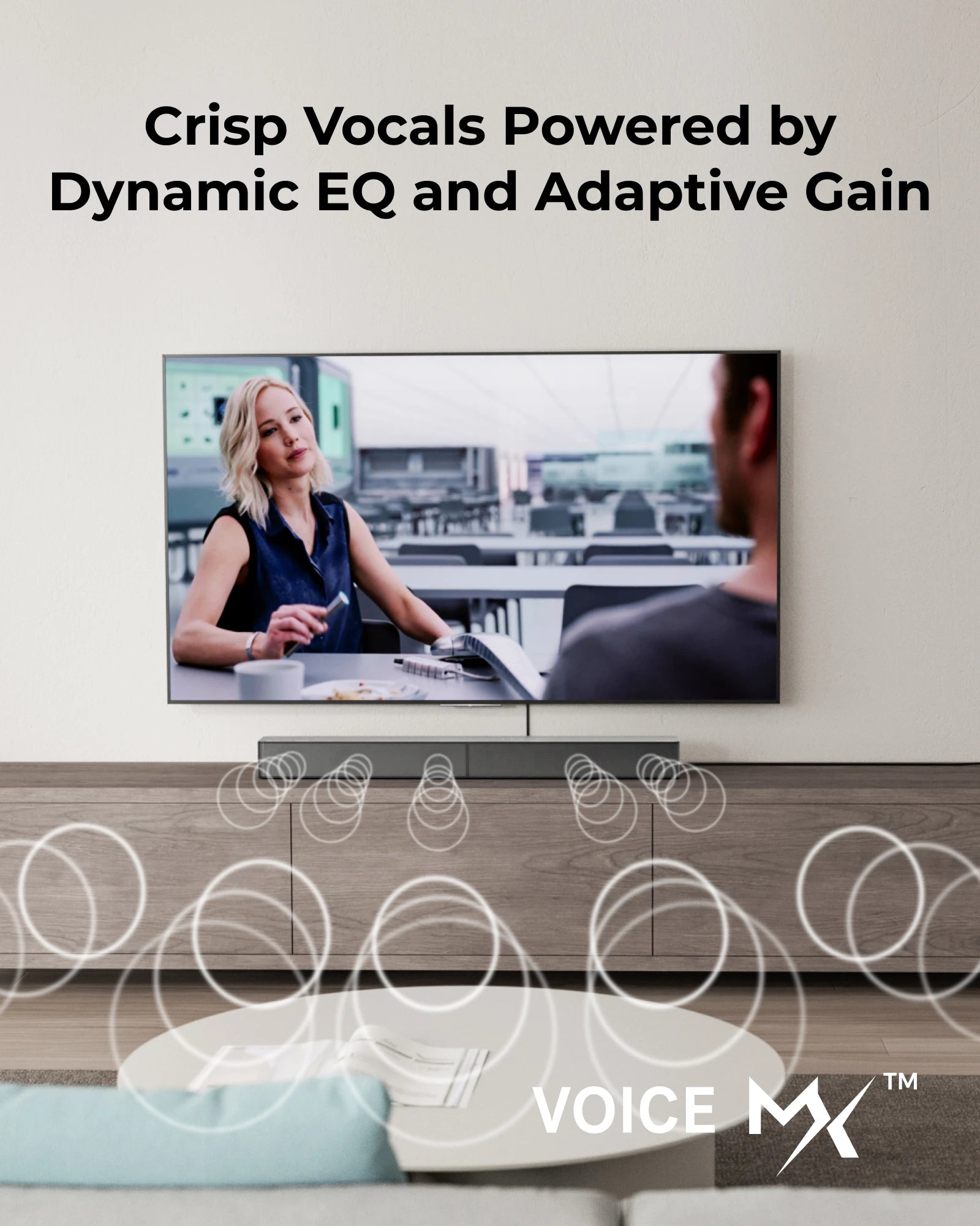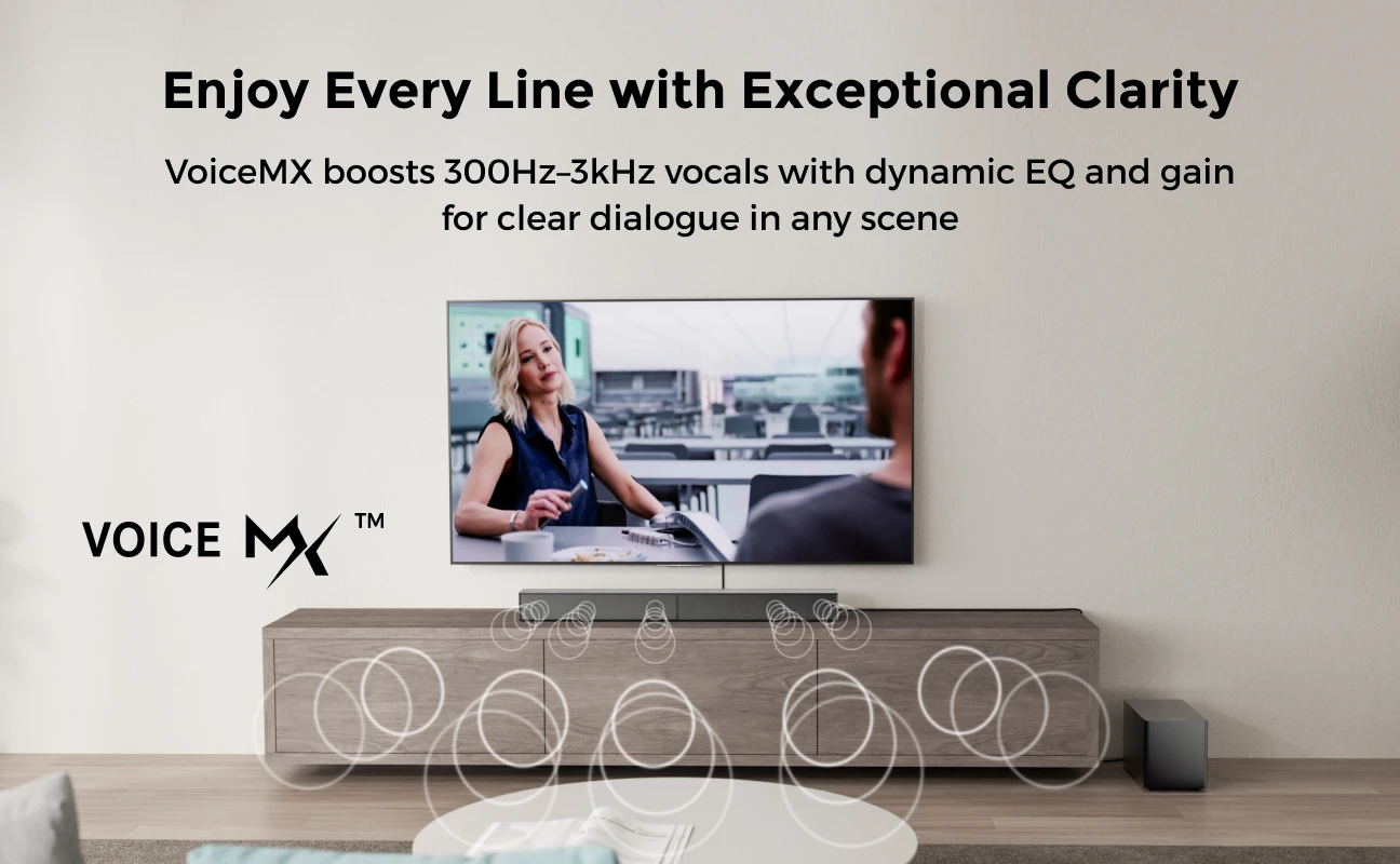 VoiceMX™ enhances the 300Hz–3kHz vocal range with dynamic EQ and adaptive gain, ensuring clear dialogue even in noisy scenes.