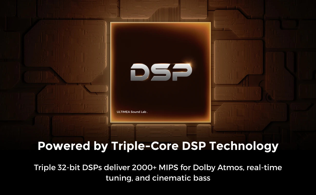 Driven by triple 32-bit DSPs—two at 800MHz and one at 600MHz—delivering over 2000 MIPS of processing power, the system unleashes cinematic surround and thunderous bass with Dolby Atmos and real-time PEQ tuning.