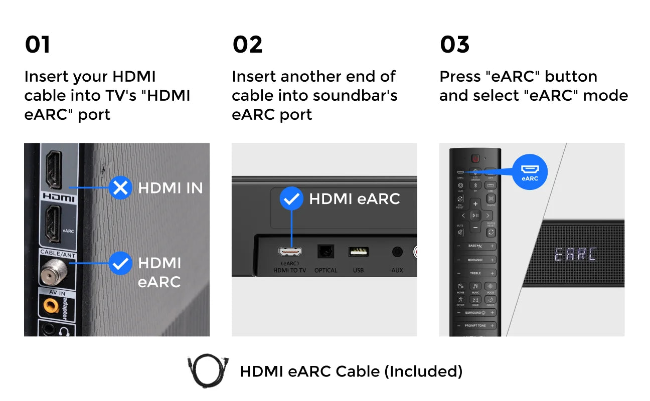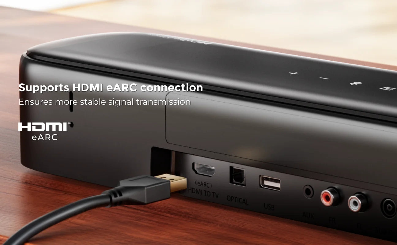 1-in/1-out 4K HDMI with eARC, ensures more stable signal transmission and streamline your life. Control both your TV and soundbar with just one remote! Power Source and Wiring Setup, recommend Room Size: 108-270ft² / 10-25m².