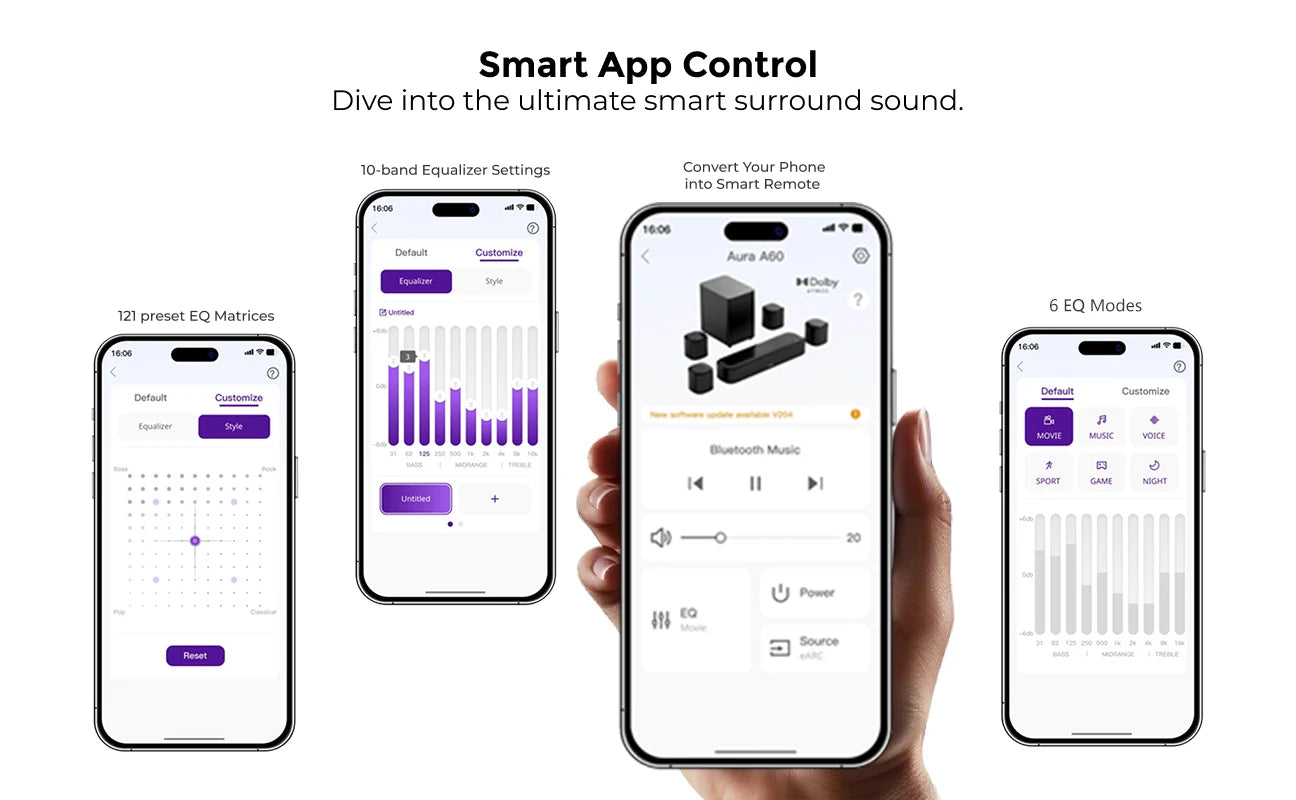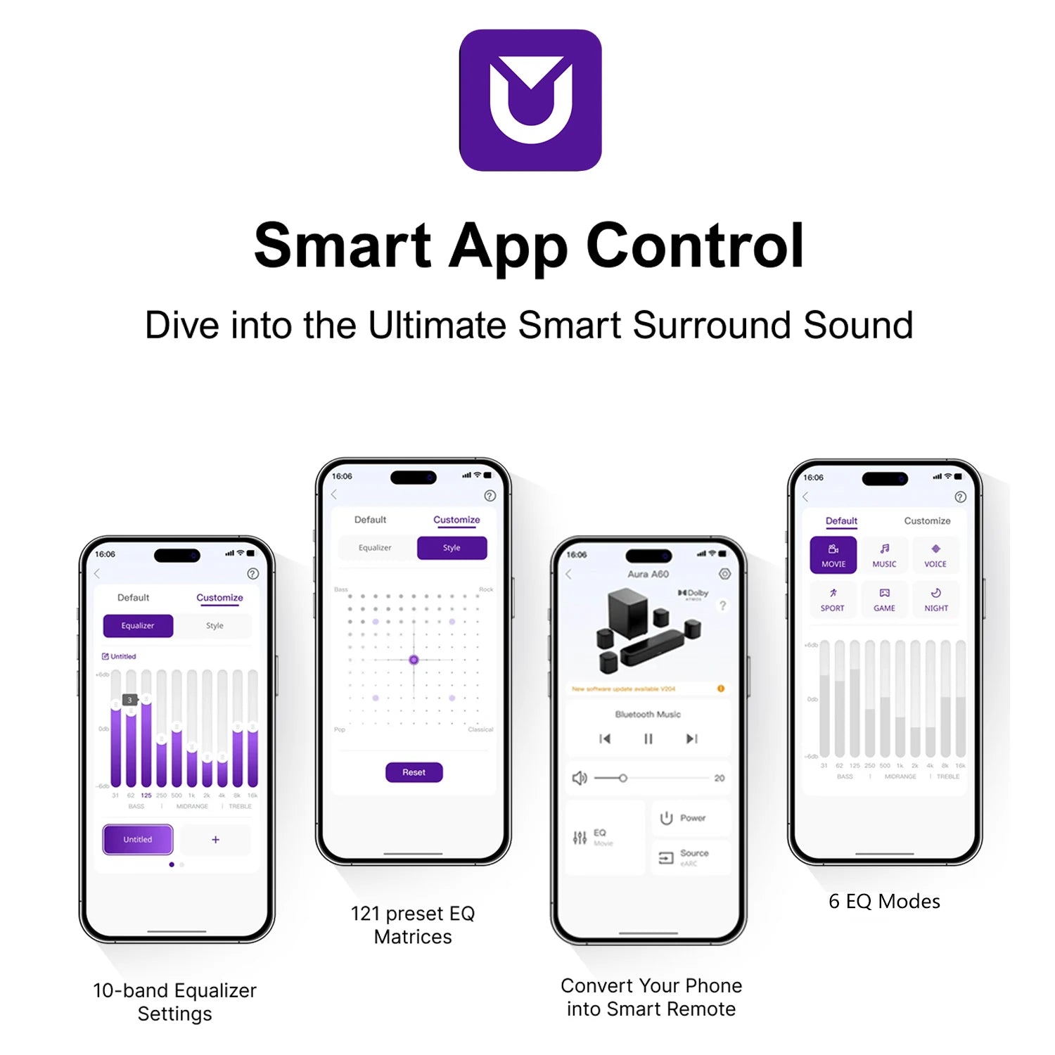Ultimea is dedicated to making life smarter through Ultimea Home. The Ultimea Smart App of this 7.1 tv soundbar can change multiple EQ, adjust bands and matrix. Stay ahead with regular OTA updates to ensure a seamless premium audio experience with the Ultimea 7.1 Virtual Surround Sound System for TV.