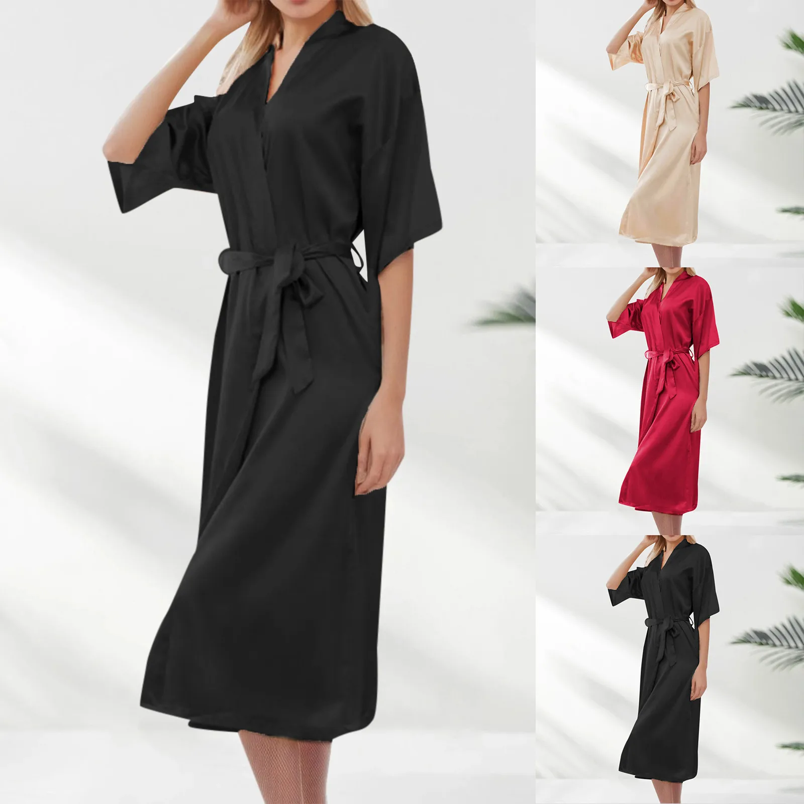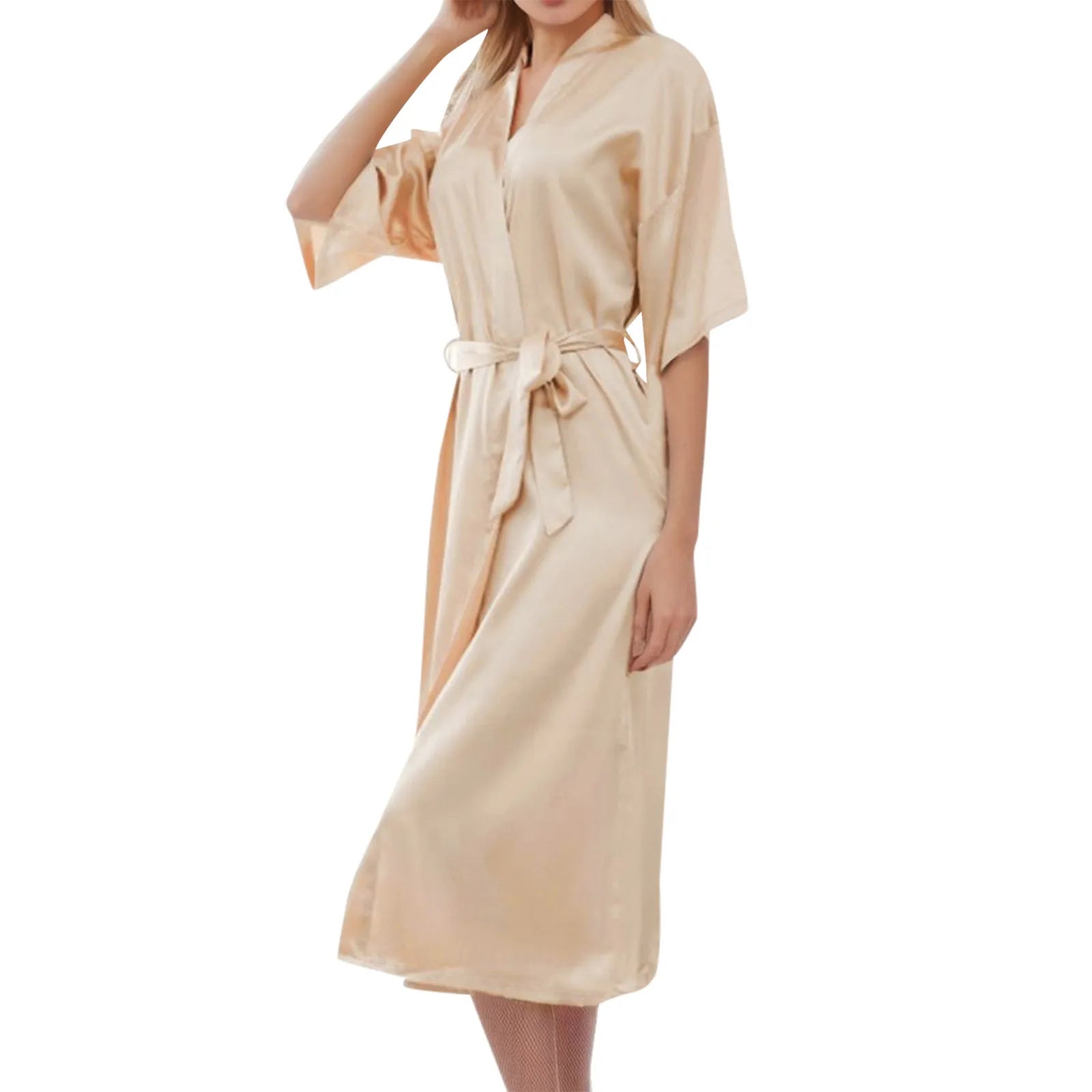 Womens Long Satin Robe Short Sleeve Kimono Silky Satin Bathrobe Bridesmaids Robe Loose Fit Sleepwear Soft Nightgown For Women