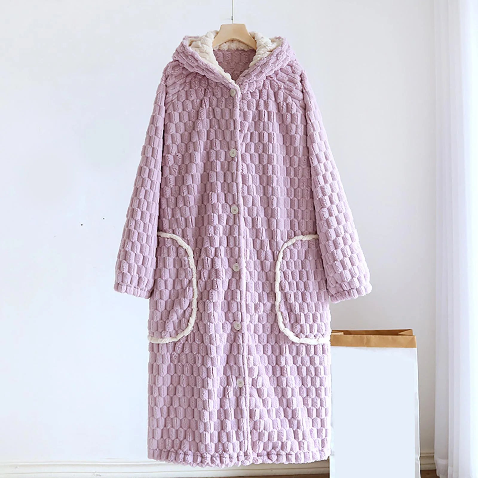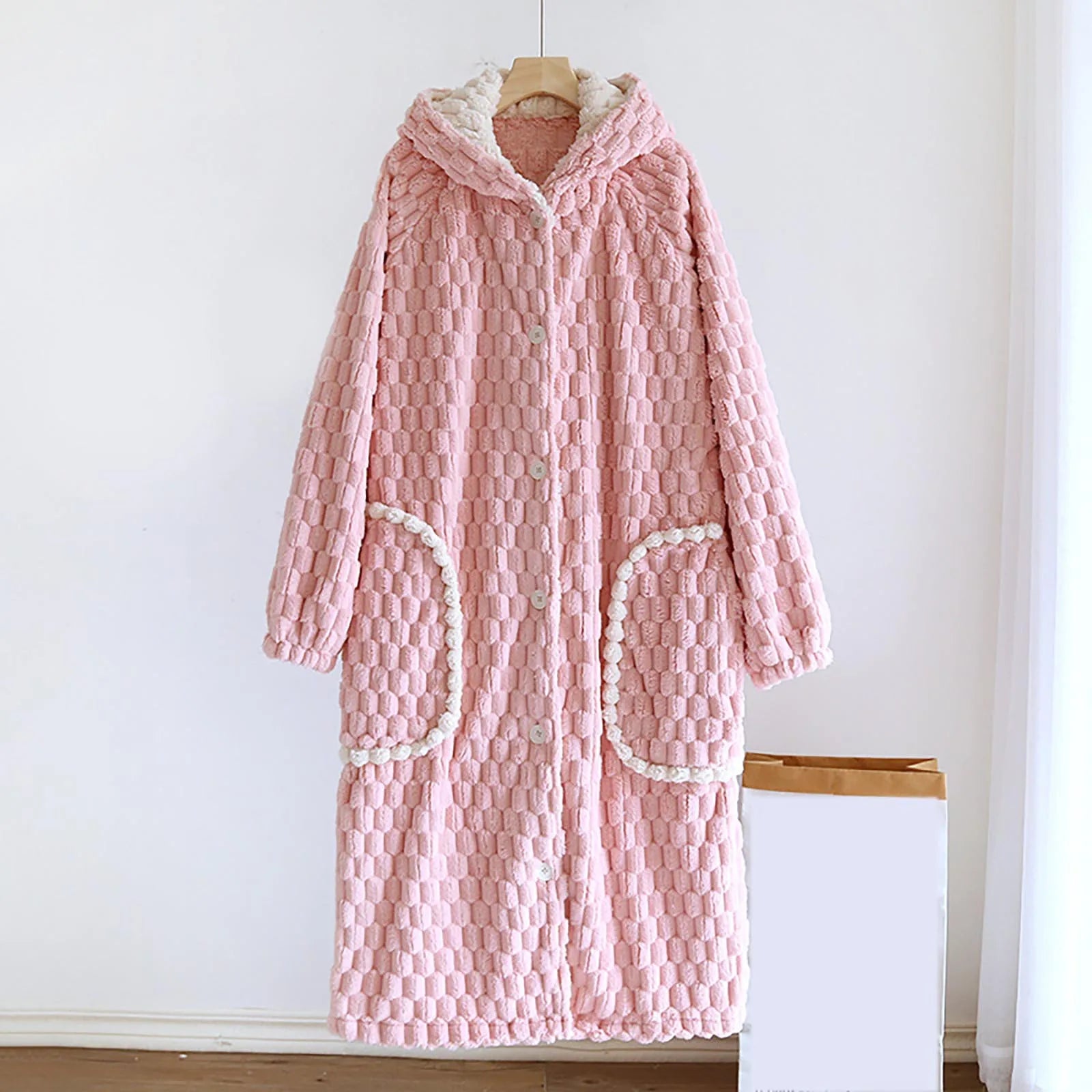 Women'S Loose Hooded Robe Nightgowns With Thick Plush Long Autumn Winter Coral Fleece Bathrobe With Big Pockets Woman Nightwear