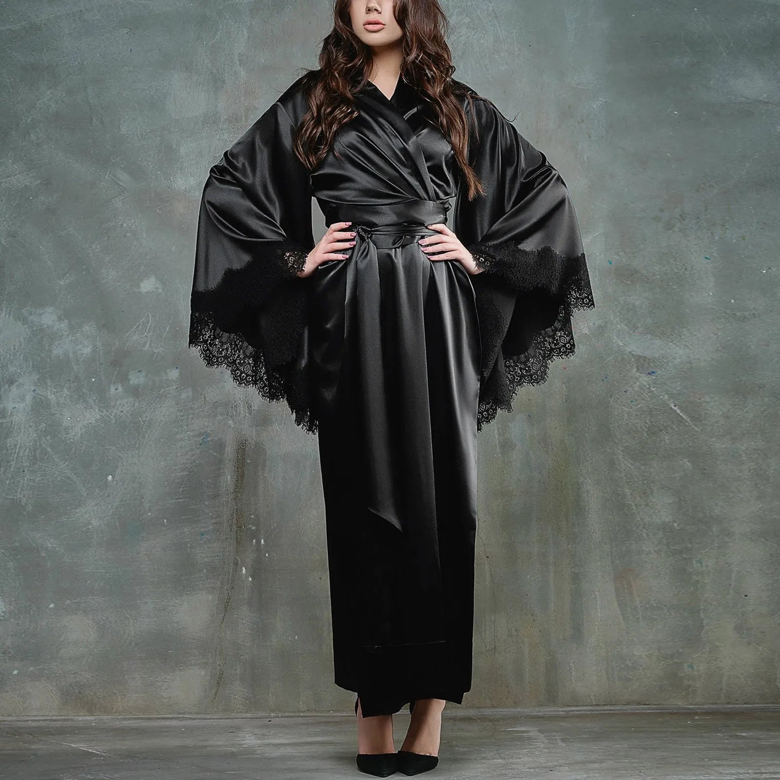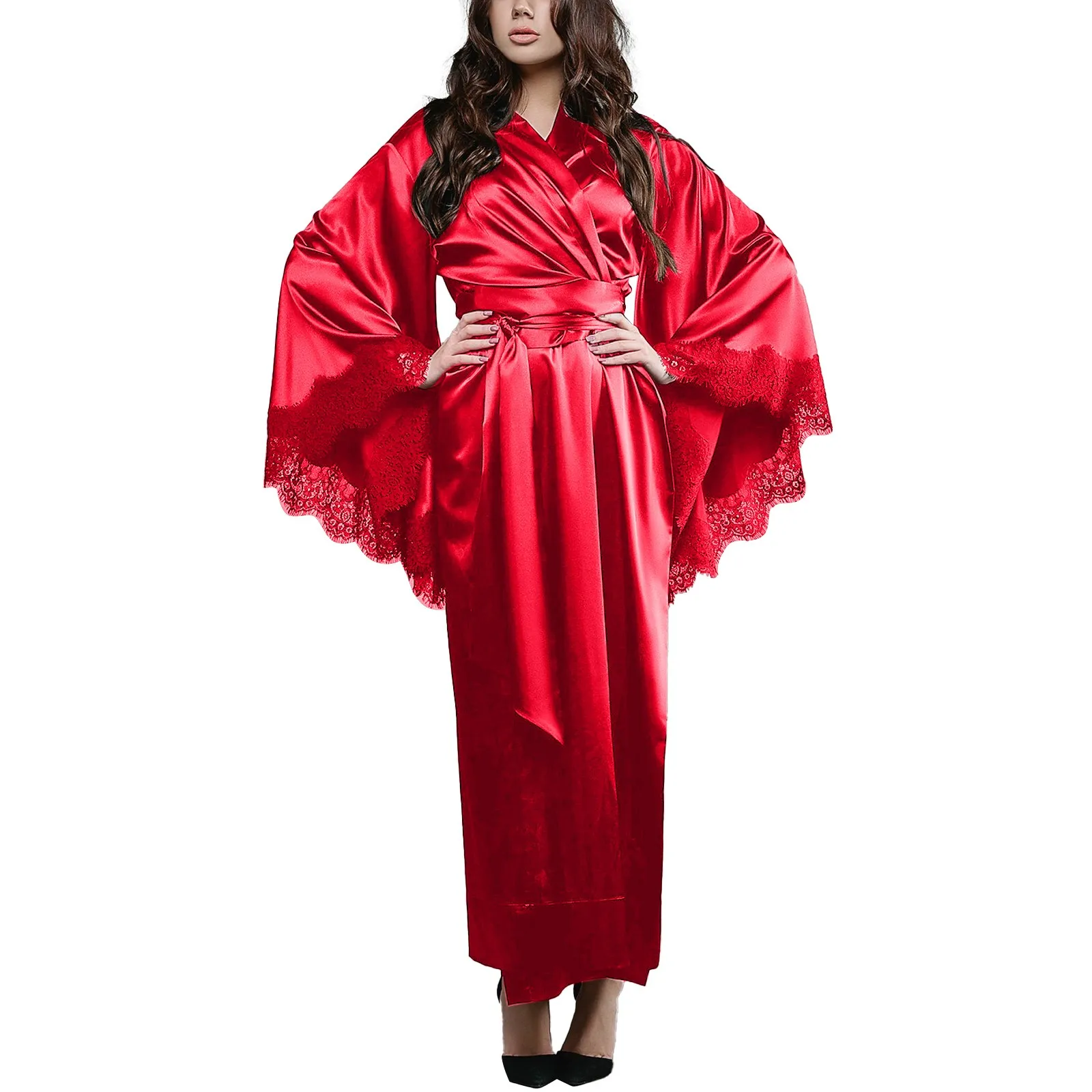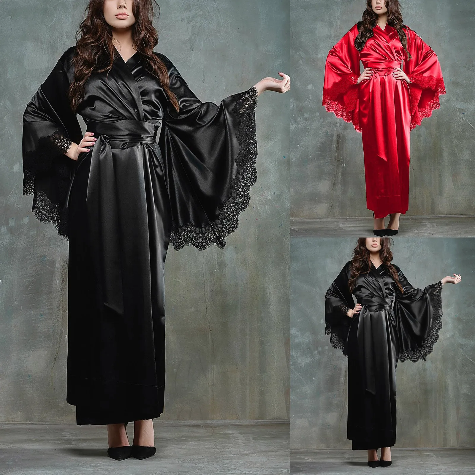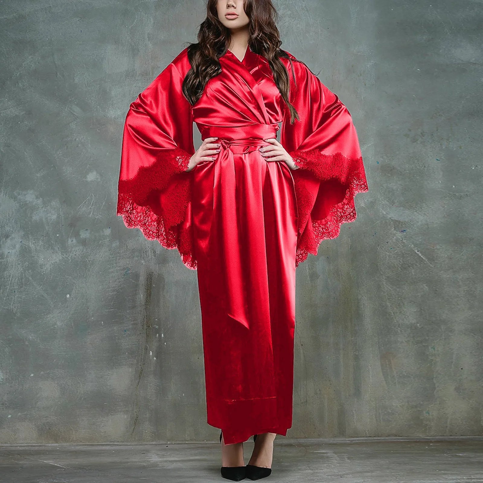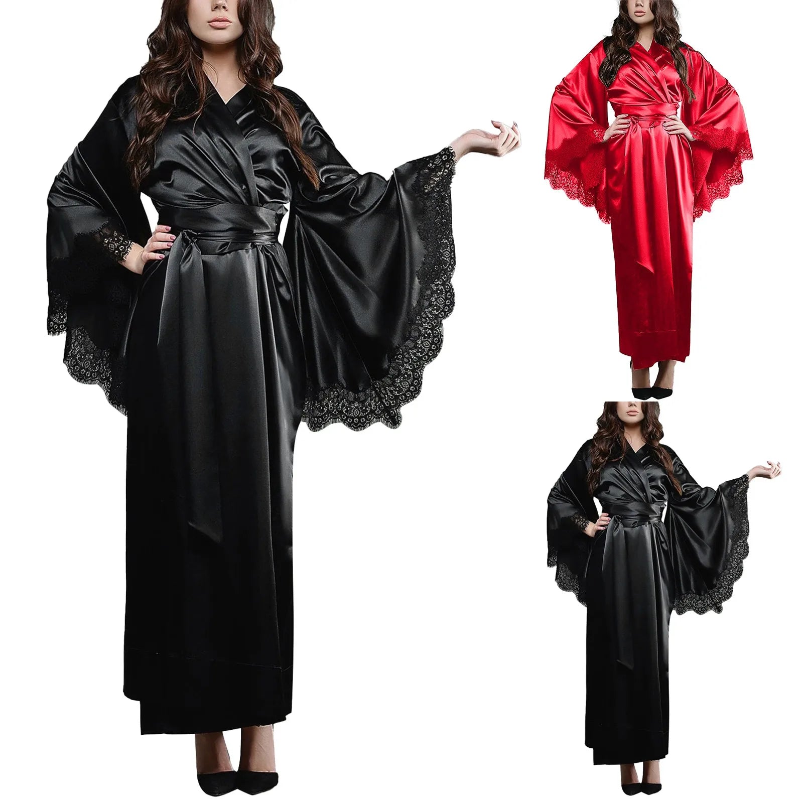Women's Sexy Long Kimono Dress Lace Bath Robe Lingerie Gown Ice Silk Nightdress Solid Color Lace Nightgown Nightwear Plus Size