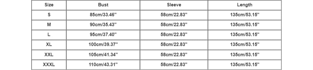 | Size:XXXL | Bust:110cm/43.31'' | Sleeve:58cm/22.83'' | Length:135cm/53.15'' |