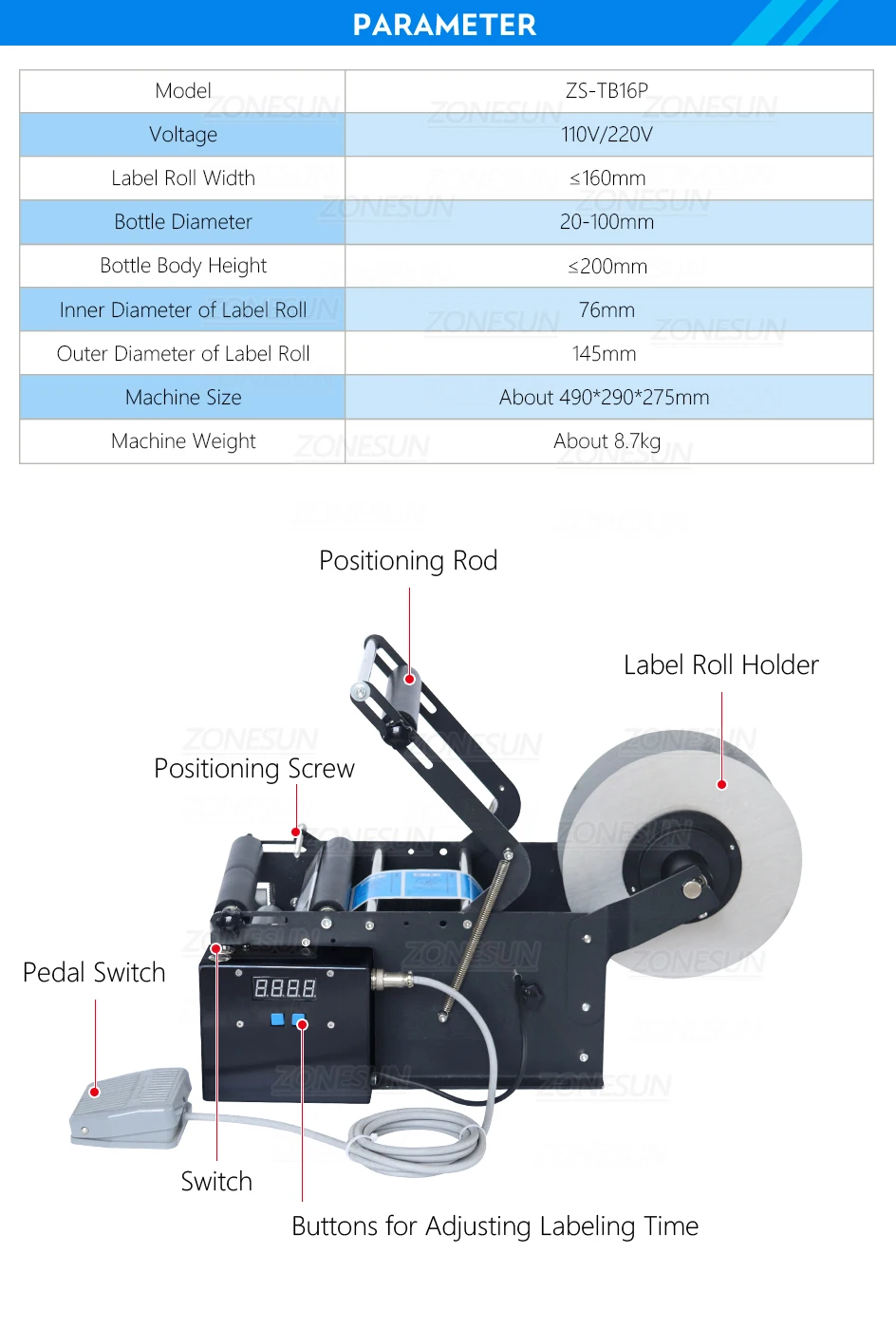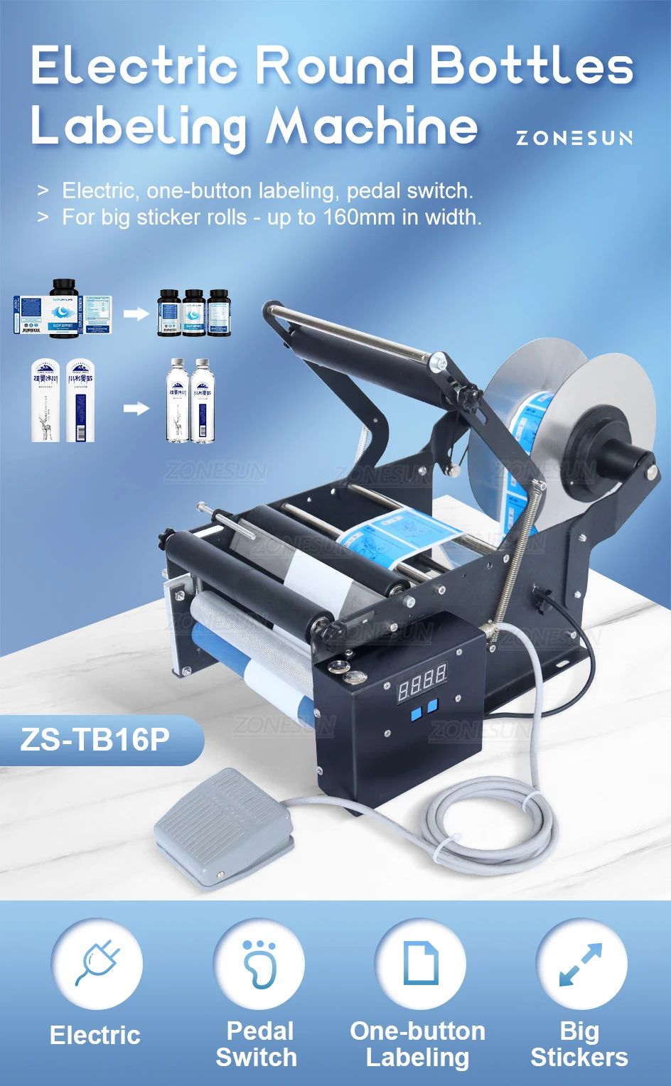 ZONESUN ZS-TB16P Round Bottle Labeling Machine Electric Semi-automatic Glass Plastic Bottle Jar With Pedal Vial Sticker Packing